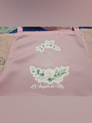 Non potevo che scegliere il colore rosa per il mio grembiule ^-^ Ho poi stampato e tagliato una composizione floreale che sto utilizzando per dei nuovi adesivi con il mio nome sulla carta da trasferimento per colori scuri, così da apprezzare maggiormente le varie sfumature di verde e di bianco panna delle foglie e dei fiori. Infine con del termo vinile verde acqua ho fatto la scritta "L'Angolo di My".